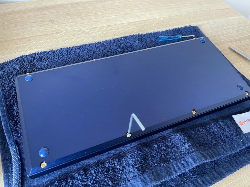 Place the keyboard upside down on a soft cloth and unscrew the 8 screws using the Allen key tool that comes with the keyboard. You will find the allen key hidden, below the Quick Start Guide sheet in the Q1’s box.