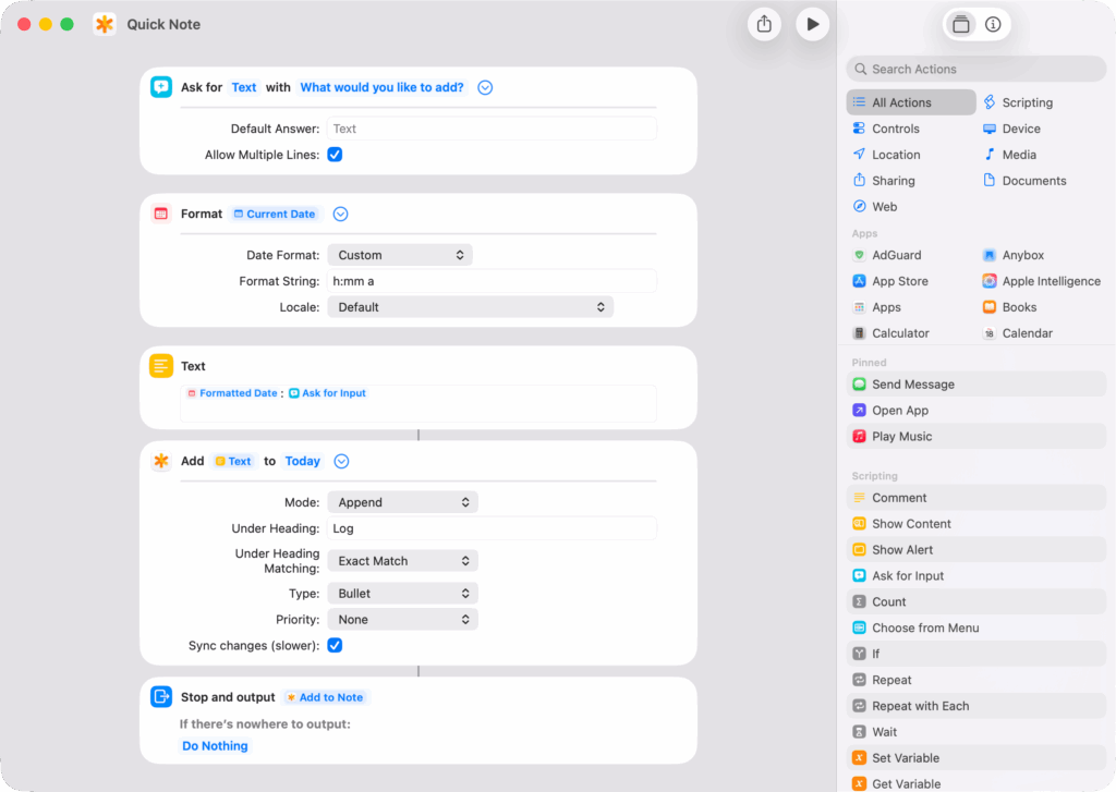 On iPhone, bring up Siri either by saying “Hey Siri” or by pressing and holding the right side button and when Siri is active, say “quick note”. When Siri begins listening, say what you want to log. Your voice will be converted to text and added under the “Log” heading in your NotePlan’s daily note at the end.