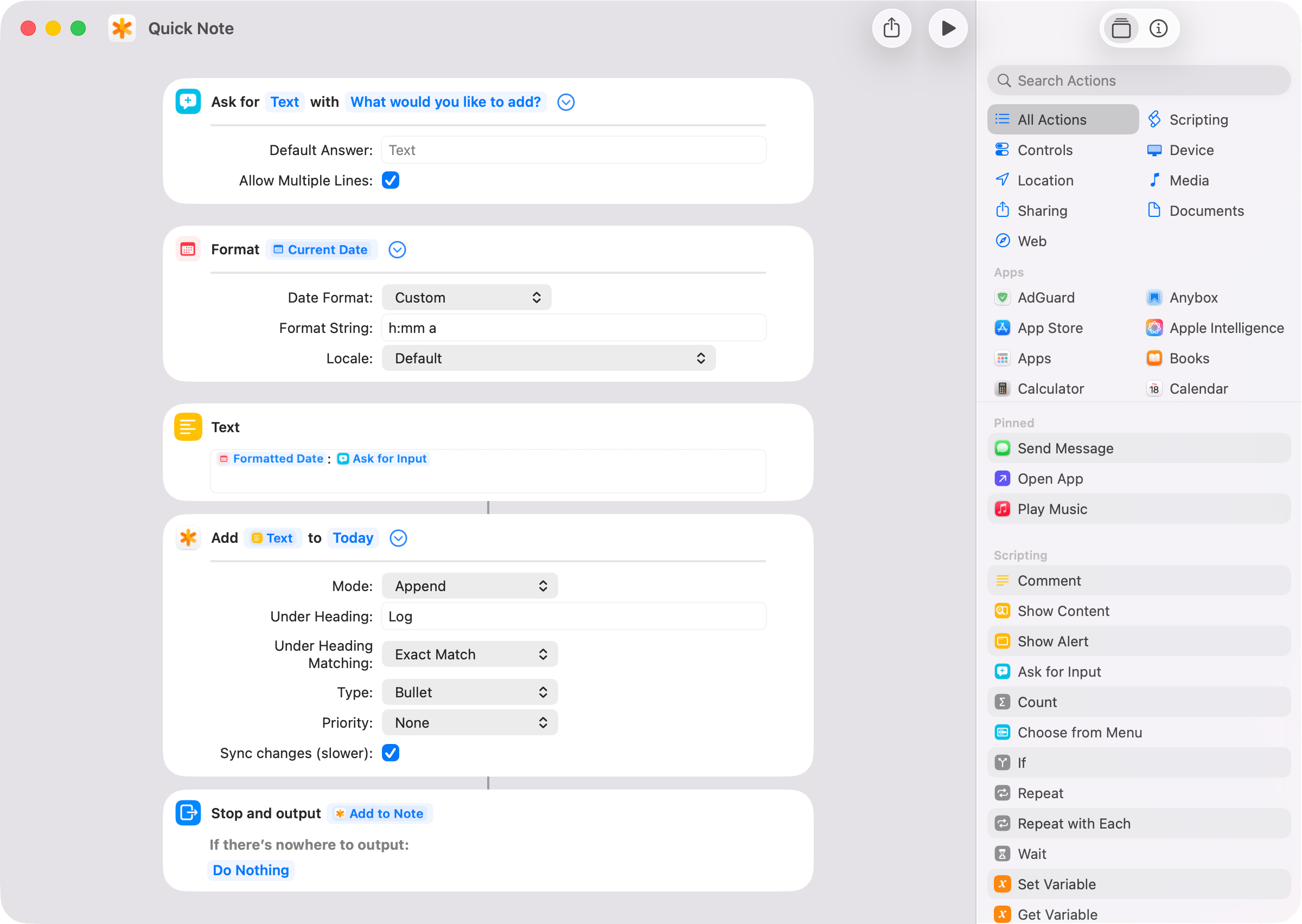 - appends it as a bullet with timestamp prefix under the “Log” heading.